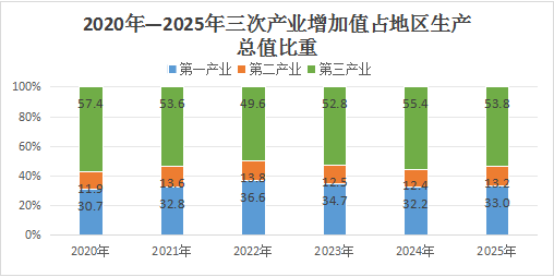 根据地区统一核算结果,全年实现地区生产总值(GDP)115.34亿元,比上年增长5.3%(按可比价计算,下同)。其中,第一产业增加值38.05亿元,增长5.3%;第二产业增加值15.28亿元,增长14.4%;第三产业增加值62.01亿元,增长3.4%。三次产业结构为33.0:13.2:53.8。分季度看,一季度地区生产总值同比增长3.9%,上半年增长5.1%,前三季度增长4.8%,全年增长5.3%。