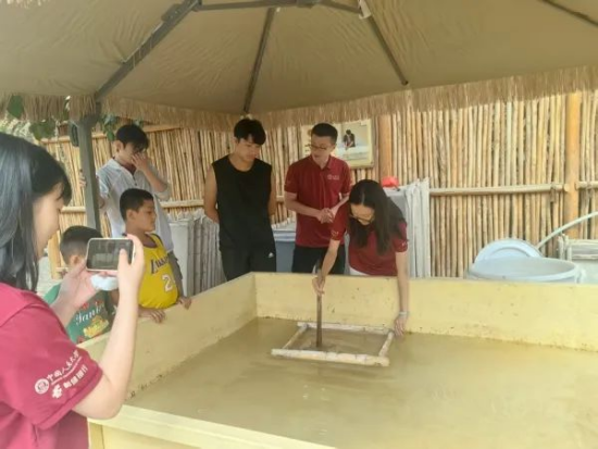 在产业园的核心区域,学生们亲眼见证了桑皮纸从原料到成品的神奇转变。只见两位村民熟练地将浸泡后的桑树皮外层黑皮剥离,留下内皮作为造纸的原料。随后,这些桑树皮被送入大铁锅,经过高温煮制变得柔软可塑。村民们手执沉重的木榔头,一次次击打,将煮软的桑树皮敲打成细腻的桑泥饼,这一步骤看似简单,实则蕴含着千锤百炼的匠心独运。
