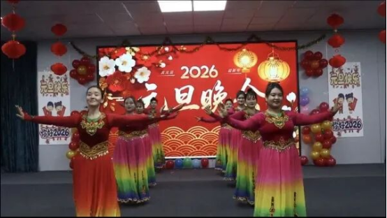 近日,阿克萨拉依乡精心组织举办庆元旦文艺会演。150余名职工群众欢聚一堂、共叙情谊,共话发展新愿景,以文艺之姿喜迎2026年到来。文艺表演环节,开场舞《新疆山水美》瞬间点燃现场氛围,诗朗诵《我爱上班》以轻松幽默的方式表达了职场人的心声,给现场观众带来阵阵欢笑,引发了观众的共鸣。舞蹈《撸起袖子加油干》《新疆人爱新疆》《红红火火中国年》轮播登场,精彩的表演引得台下掌声雷动,喝彩连连。
