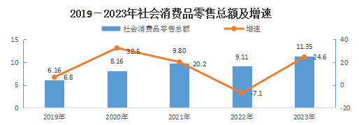 全年社会消费品零售总额11.35亿元,比上年增长24.6%。按经营地统计,城镇消费品零售额7.92亿元,上升26.1%;乡村消费品零售额3.43亿元,上升21.1%。按消费类型统计,商品零售额9.96亿元,上升17.1%;餐饮收入额1.39亿元,上升112%。