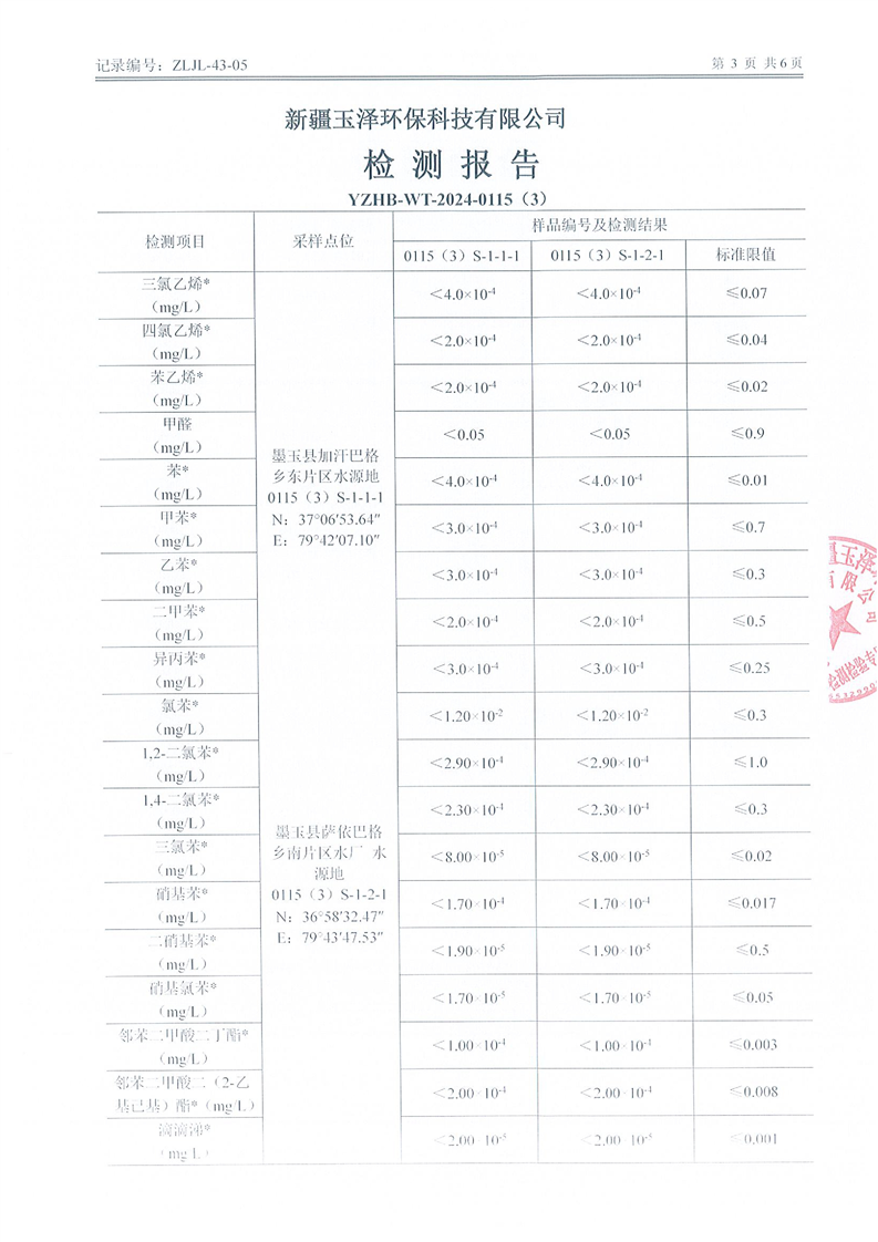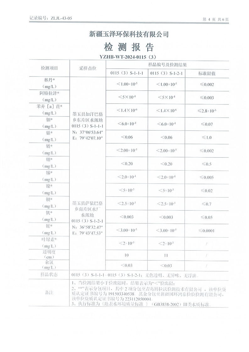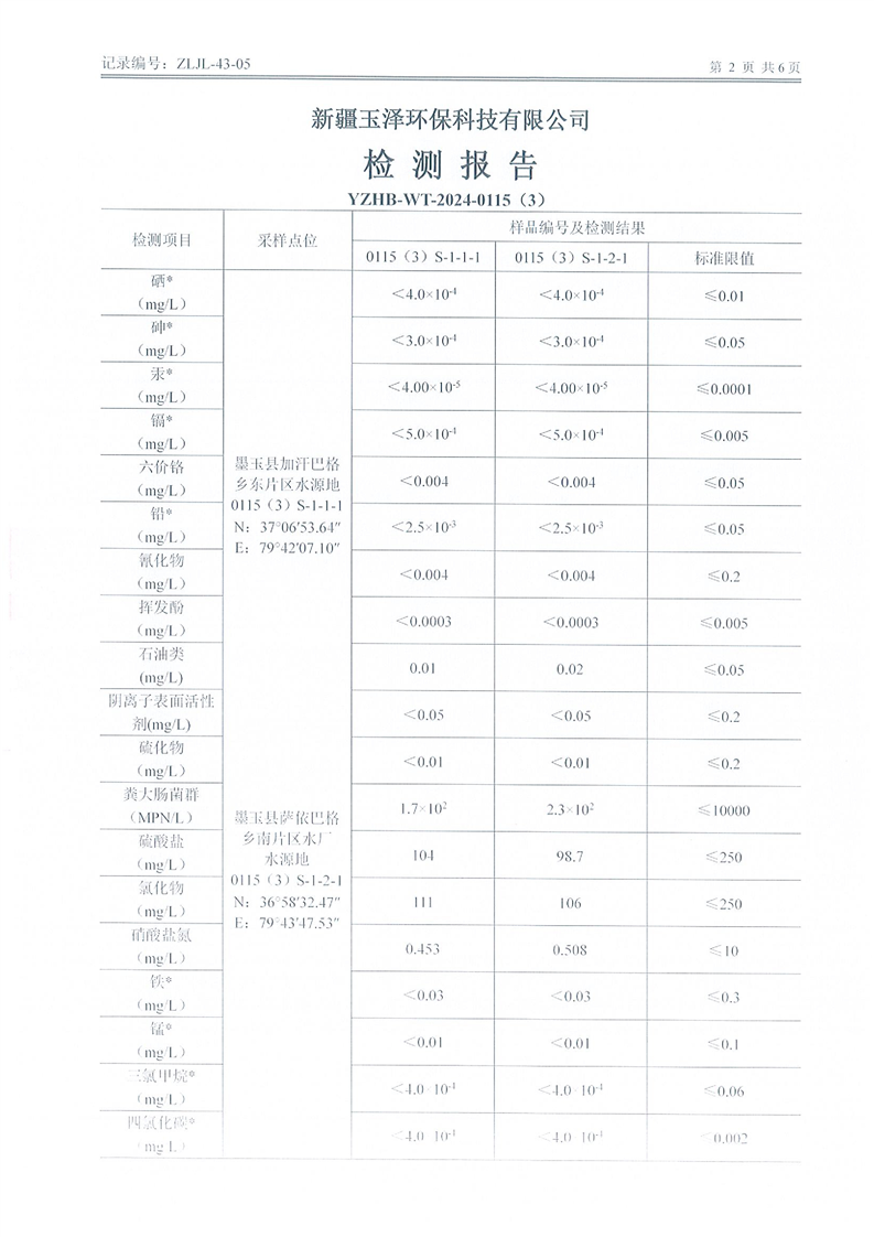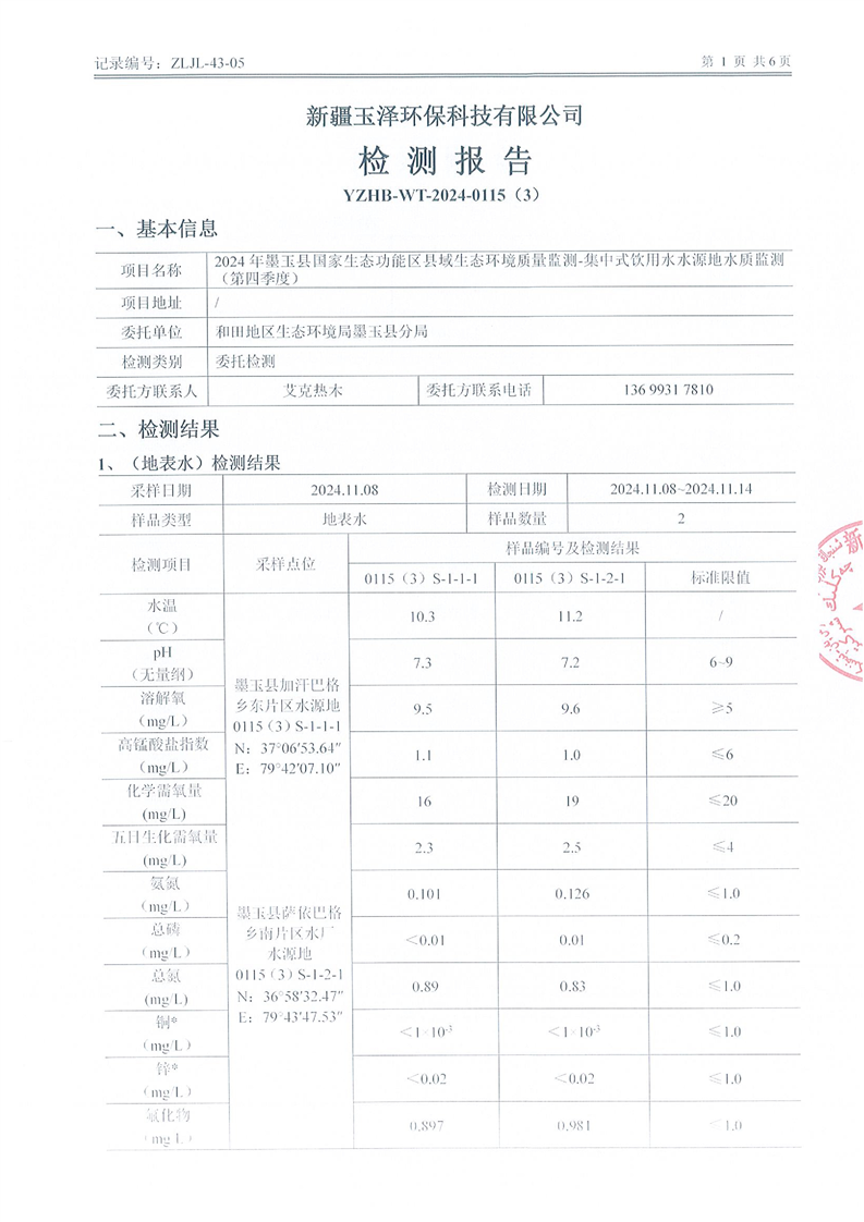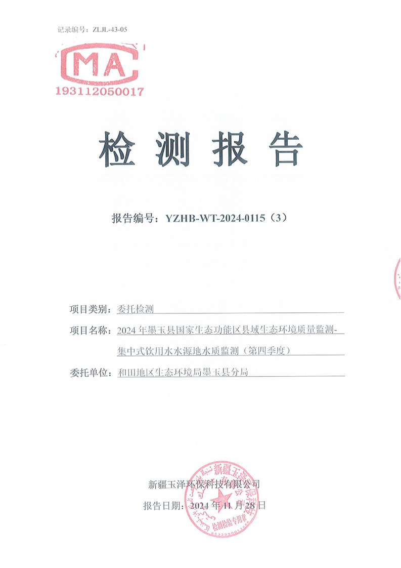 2024年墨玉县国家生态功能区县域生态环境质量监测-集中式饮用水水源地水质监测(第四季度)
