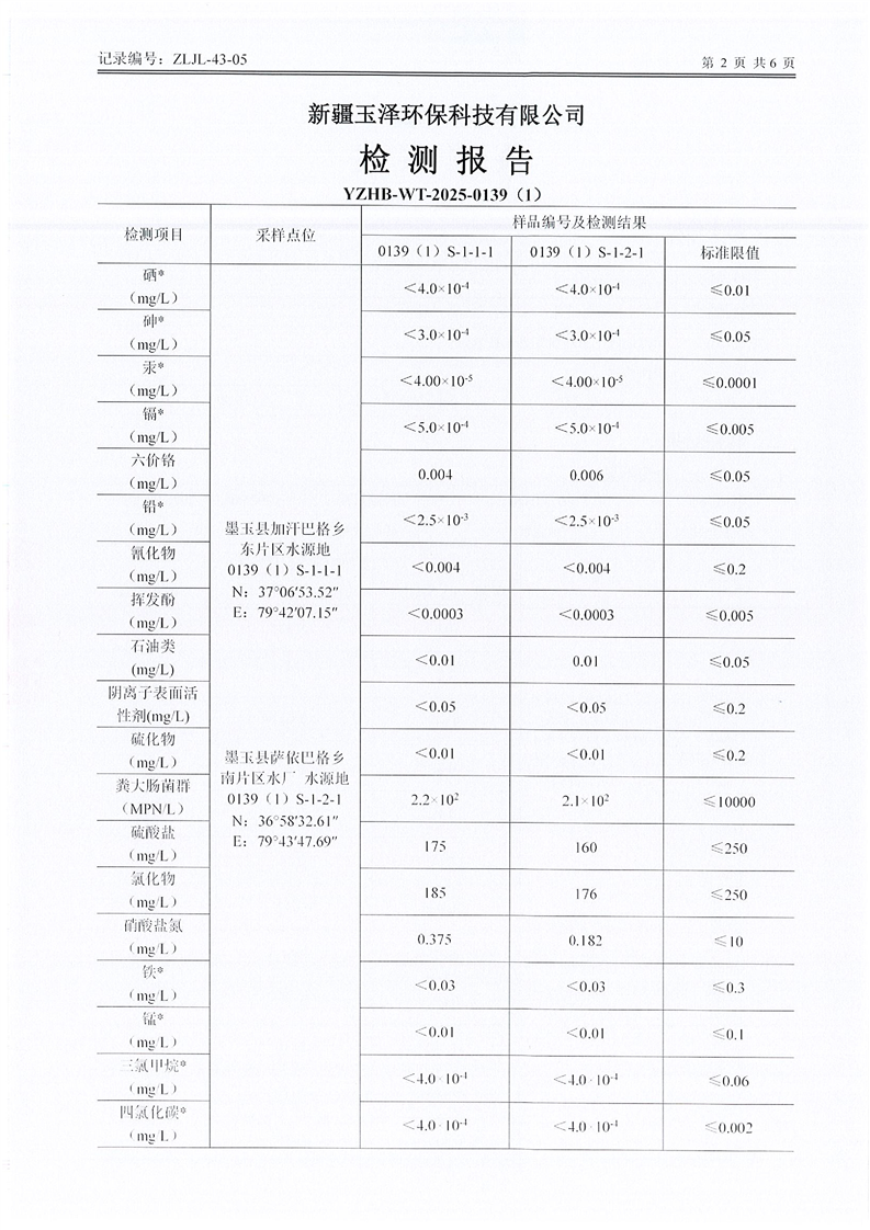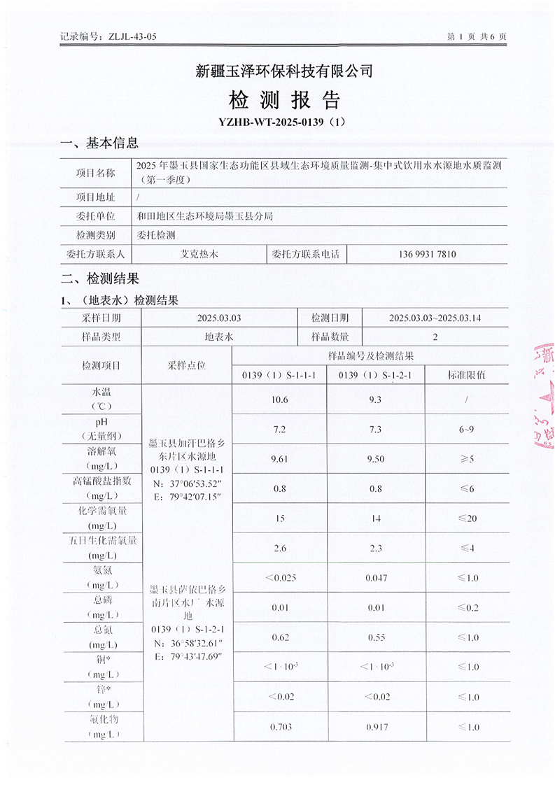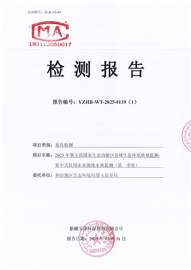 2025年墨玉县国家生态功能区县域生态环境质量监测-集中式饮用水水源地水质监测 (第一季度)