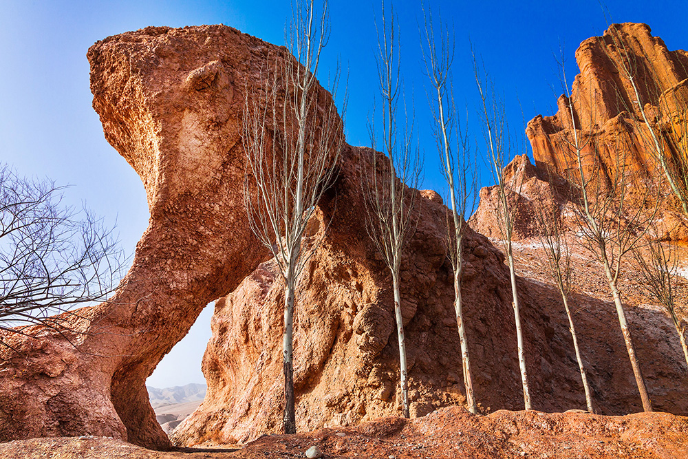 象鼻高度为20米左右,象头高约40米,象鼻与身体构成的孔洞大概有60平米,蜿蜒的喀拉喀什河从空洞中穿过。据考证这个象鼻山的形成是风蚀和水蚀作用共同所致,象鼻山背靠的岩石如刀劈斧削般笔直陡峭,好似天空垂下的大幕布,很像狼牙山。象鼻洞下有三个长年河水冲刷形成的三个小岛,小岛上的石头仔细看很多都像动物,如京巴狗、海狮、藏獒等,卧在象鼻下,安逸的神态,仿佛是在享受大象鼻子喷水的沐浴。在象鼻洞的背面,象鼻活像一朵开放的蘑菇,也很像浙江绍兴大香林的云骨石,虽然是土质的,但其风骨犹在。