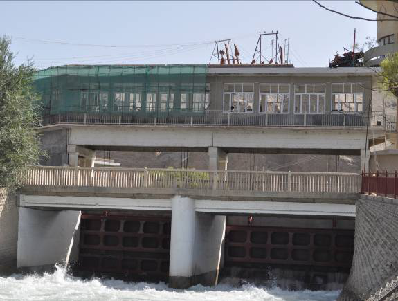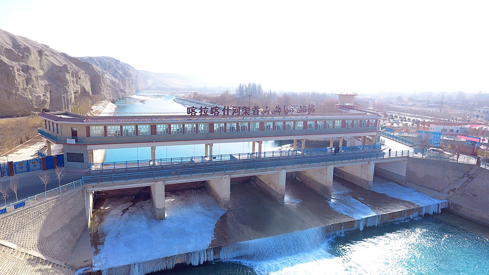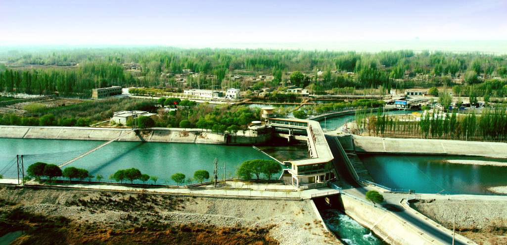 因其位于引水渠道之首,又称渠首或渠首工程,显而易见,喀拉喀什河渠首就是人们在喀河上游建造的最大的引水枢纽。以这座渠首和喀拉喀什河为界,河的右边属于和田县,河的左边属于墨玉县。而这座渠首承担着沿河两岸以及下游皮山县境内共计90万亩耕地的灌溉任务,约占和田地区总耕地面积的三分之一。除此之外,它还是数十万人畜用水的来源,同时具有引水、泄洪、排沙等综合功能。渠首位于和田市西南27 公里处,于1984 年开工建设,1988 年竣工,属于二级建筑物。它采用正面泄洪、底层排沙、上层侧向引水的形式,进水闸一共有3孔,每个孔宽约10米,其中位于左岸的两孔在墨玉县境内,而右岸的一孔在和田县境内。泄洪闸共有6孔,在马路的对面可以看到,每个孔宽约11米。这些进水闸和泄洪闸的打开闭合现在都是由电脑自动控制,整个工程完成土石方81.7万立方米,浇筑混凝土和钢筋混凝土3.26万立方米,砌石2万余立方米。远远望去,高达16米多的钢筋混凝土渠首工程蔚为壮观,它在整个和田地区的水利工程中具有举足轻重的地位。我们一路沿途走来所看见的干渠支渠中的水全部引自这里,可以毫不夸张的说,这座工程是整个和田地区最大的富民工程。