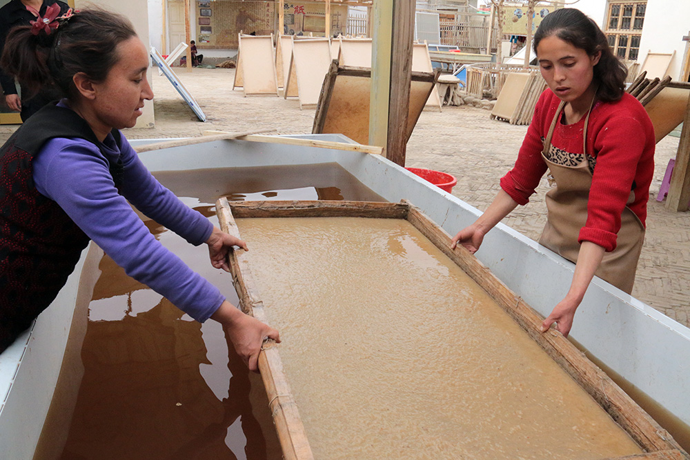 墨玉的桑皮纸被称为人类纸业的“活化石”,它记录着我国新疆地区传统造纸工艺,是人们了解纸文化历史的一个窗口。经历了短暂的低迷期,桑皮纸重新焕发光芒,活跃在国际、国内的书画展览舞台上。桑皮纸是以桑树枝内皮为原料手工制作的纸,距今已有1300余年的历史,被誉为人类纸业的“活化石”。2010年,墨玉县分四期投入资金600余万元,对普恰克其乡布达村主干道1.2万平方米的商户门面和农户家庭墙面进行了改造,建成了以桑皮纸制作技艺传承中心为核心的桑皮纸一条街。